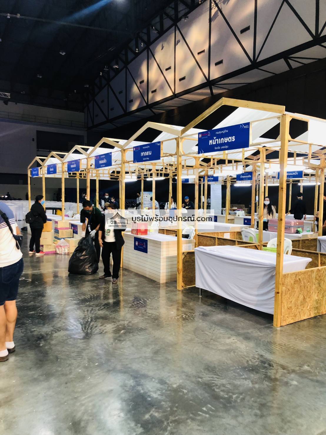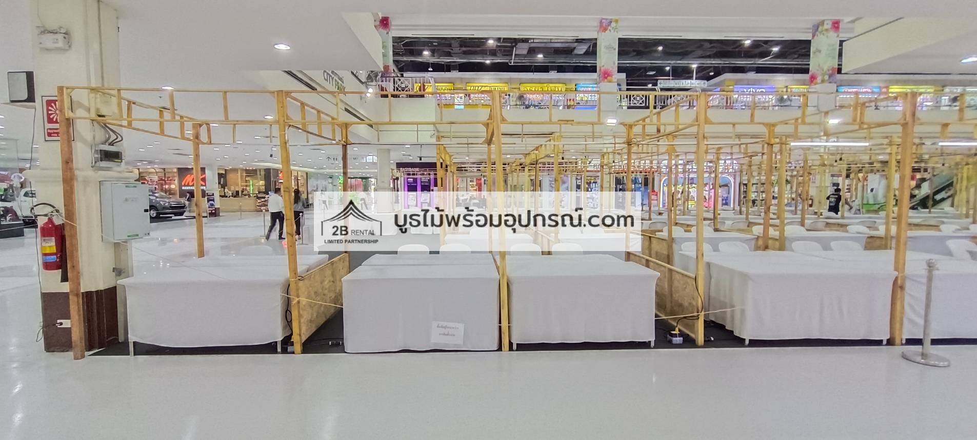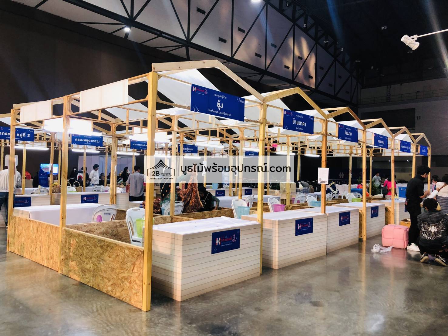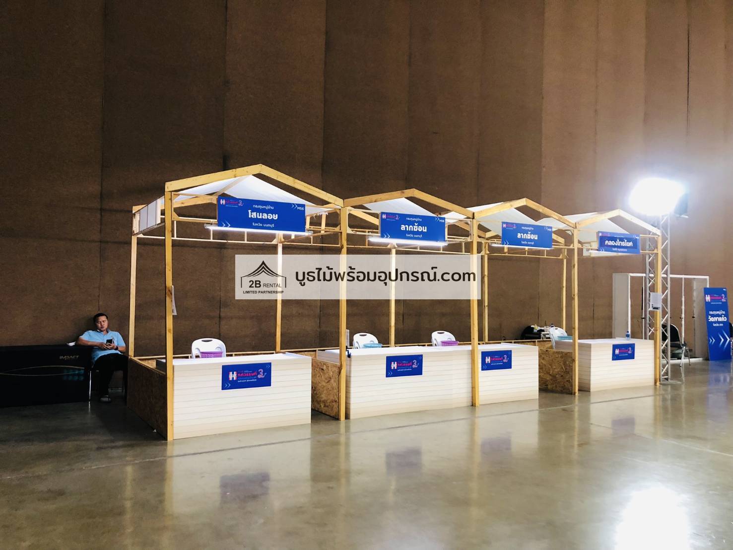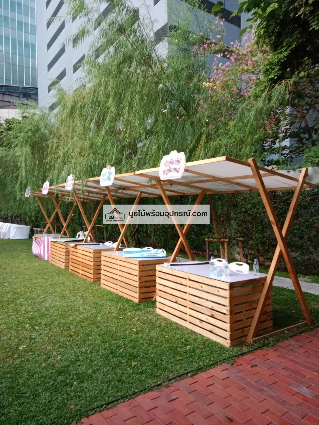 - บูธไม้ บูธพาร์ทิชั่นทุกขนาด พร้อมอุปกรณ์ภายในบูธ เช่นปลั๊กไฟ ไฟส่องสว่าง โต๊ะ เก้าอี้ ถังขยะฯลฯ
